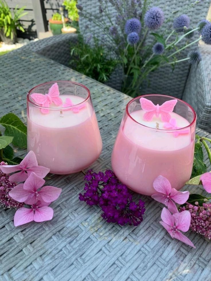 Delicadas velas em tons de rosa, decoradas com pequenas borboletas, ideais como lembrança de 15 anos.